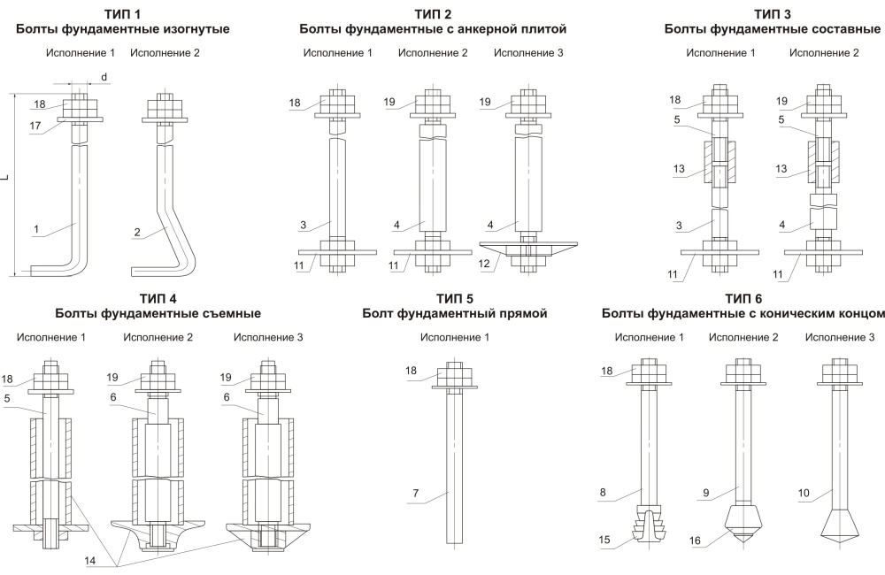 В рамках одного фундамента могут использоваться различные типы болтов.